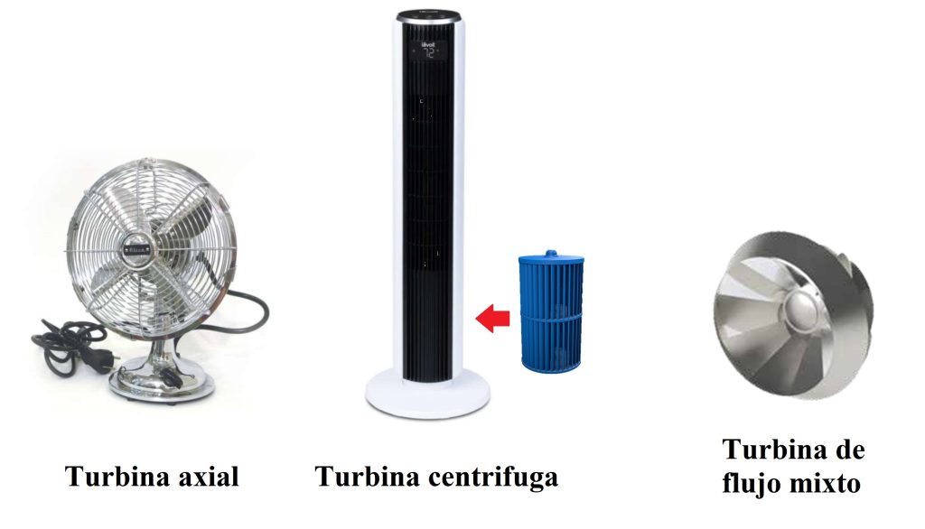 Los impulsores suelen ser divididos en 3 grupos principales: propelas axiales, como la de los ventiladores de techo o de pedestal que utilizamos en nuestros hogares, se podría decir que tienen aspas planas; turbinas centrifugas, como las que utilizan los recientes ventiladores de “torre”, estas turbinas tienen forma de cilindro; y existe un tercer tipo más reciente llamado turbina de flujo mixto, el cual es un punto medio entre ambas formas, y su forma se asemeja a un cono, este tipo generalmente solo se utiliza en aplicaciones de uso industrial.