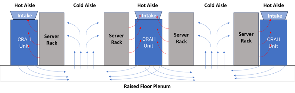 Durante décadas, esto se logró mediante estrategias basadas en el aire, como el confinamiento de pasillos fríos y calientes, utilizando unidades de tratamiento de aire para salas de servidores y plenums de piso elevado. El aire frío se suministra al pasillo frío, circula a través de los racks de servidores, absorbe el calor y se expulsa al pasillo caliente. Este diseño resultó eficaz para la industria cuando las densidades de calor promediaban entre cinco y diez kilovatios por rack.