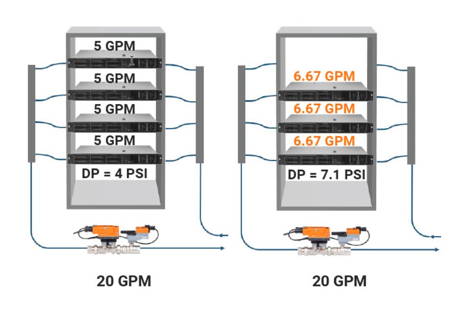 Para que la refrigeración líquida funcione eficazmente, se requiere un control preciso. Un caudal demasiado bajo puede provocar el sobrecalentamiento de los componentes. Un caudal demasiado alto puede causar erosión en las placas de refrigeración, un desperdicio de energía de la bomba y la desestabilización del rendimiento del sistema. Belimo aporta décadas de experiencia en el control de caudal en sistemas HVAC para afrontar este desafío.
