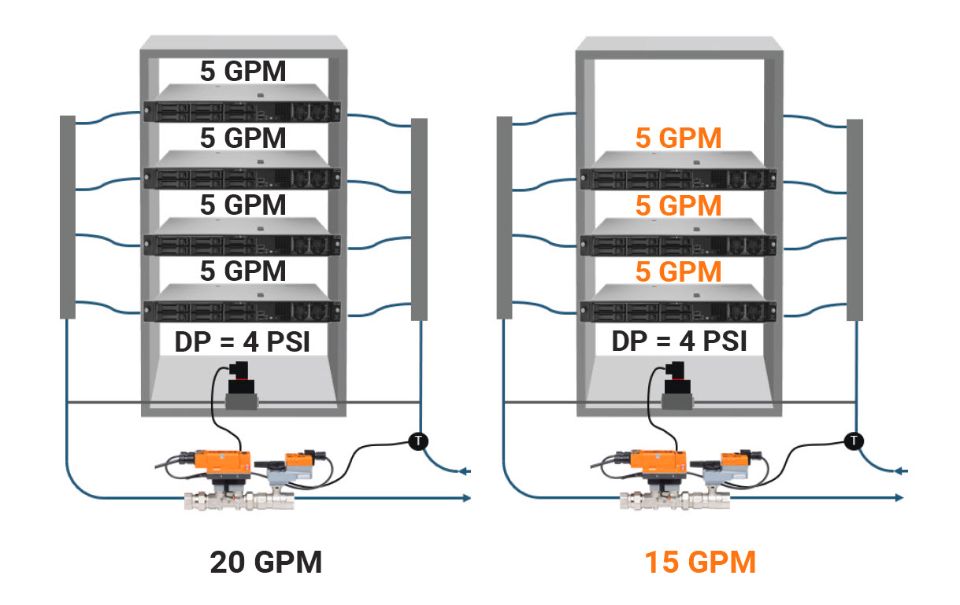 El control tradicional de la posición de las válvulas puede resultar poco fiable, ya que depende de las fluctuaciones de presión durante el funcionamiento. Las válvulas electrónicas independientes de la presión (EPIV) de Belimo proporcionan un flujo estable independientemente de las variaciones de presión del sistema. La válvula de energía de Belimo va más allá e incorpora control de potencia, utilizando datos de flujo y diferencia de temperatura para regular las cargas térmicas directamente en kilovatios o BTU por hora. Este nivel de precisión es especialmente valioso en entornos de refrigeración de servidores GPU de alta densidad.
